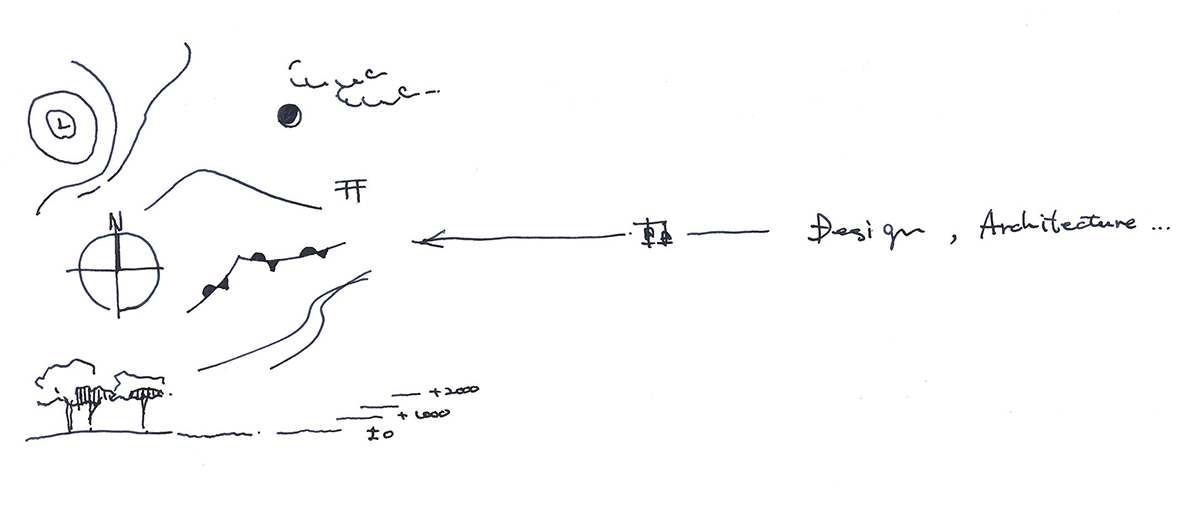 ランドスケープや建築計画で重要な要素である「軸線の取り方」。ユナイテッドデザインではフィールドワークを通じ、気候、地形、歴史、地域信仰などから軸を取る。それは時により地政学や利便性や生産効率より優先される。特に古くからある集落や古文書、地形図などが参考とされる。